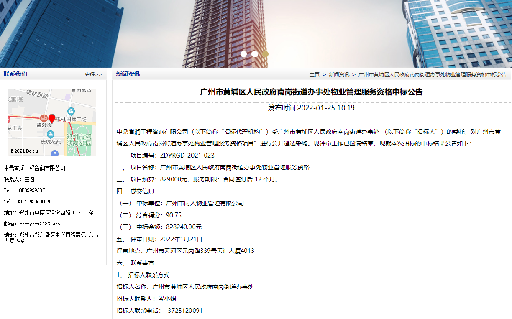 鼎點(diǎn)娛樂工程咨詢有限公司(以下簡(jiǎn)稱“招標(biāo)代理機(jī)構(gòu)”)受廣州市黃埔區(qū)人民政府南崗街道辦事處 (以下簡(jiǎn)稱“招標(biāo)人”)的委托,對(duì)廣州市黃埔區(qū)人民政府南崗街道辦事處物業(yè)管理服務(wù)資格項(xiàng)目”進(jìn)行公開遴選采購(gòu),F(xiàn)評(píng)審工作已圓滿結(jié)束,現(xiàn)就本次招標(biāo)的中標(biāo)結(jié)果公告如下:一、項(xiàng)目編號(hào):ZDYRGD-2021-023二、項(xiàng)目名[詳細(xì)]
